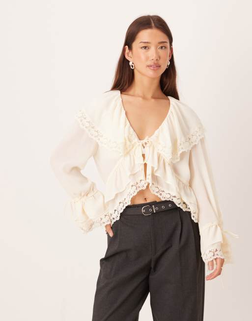 YAS – Kremowa bluzka z koronkowym wykończeniem i falbankami w stylu boho