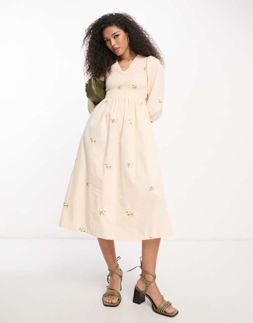 Y.A.S – Luźna kremowa sukienka midi z ozdobnym dekoltem w haftowany kwiatowy wzór