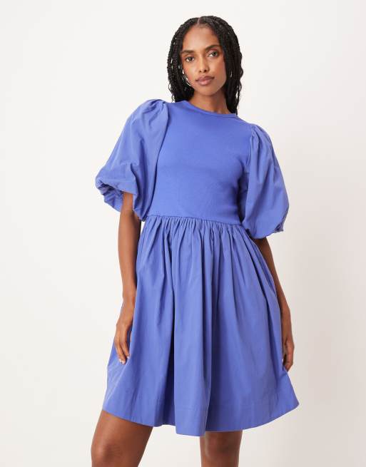 YAS – Niebieska sukienka mini z bawełny i dżerseju z bufkami