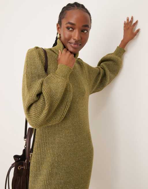 YAS – Oliwkowa dzianinowa sukienka z długimi rękawami i golfem