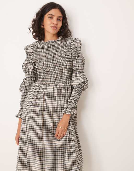 YAS – Sukienka midi z długim rękawem i marszczeniem w beżową kratkę