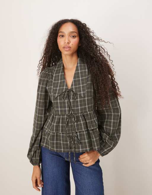 YAS – Wiązana z przodu bluzka z kołnierzem i wzorem w zieloną kratę