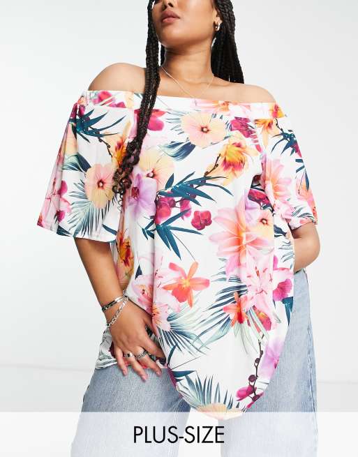 Yours – Biały top z dekoltem bardot w tropikalny wzór kwiatowy