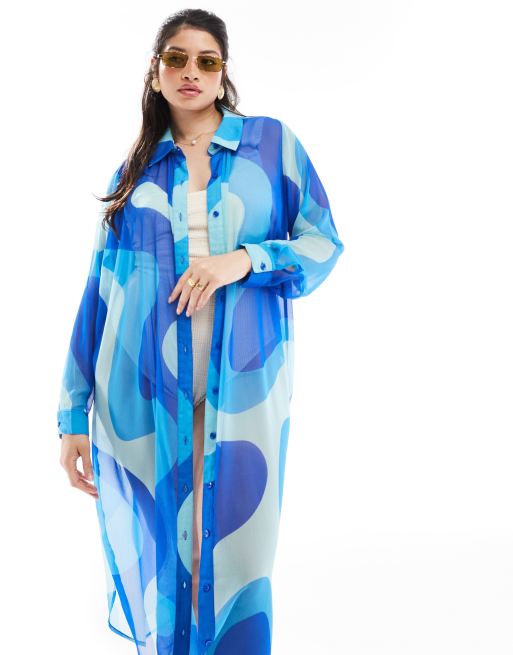 Yours – Narzutka plażowa średniej długości w niebieski abstrakcyjny wzór