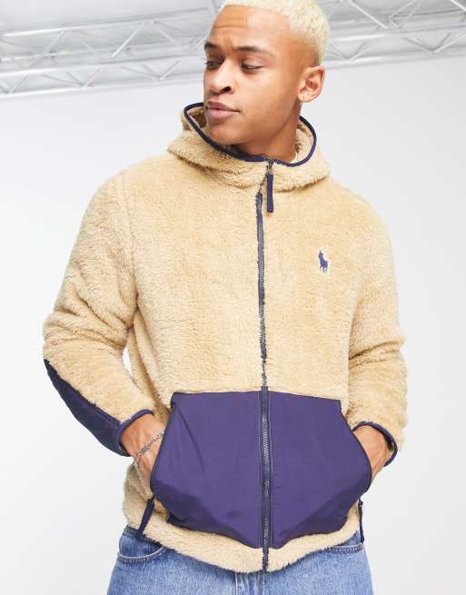 Polo Ralph Lauren icon logo curly borg colourblock full zip hoodie in sand/navy