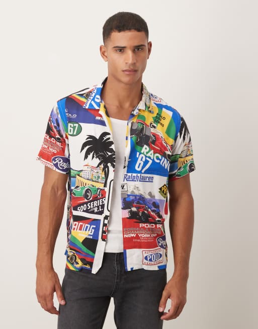 Polo Ralph Lauren revere collar race poster print short sleeve rayon shirt in multi