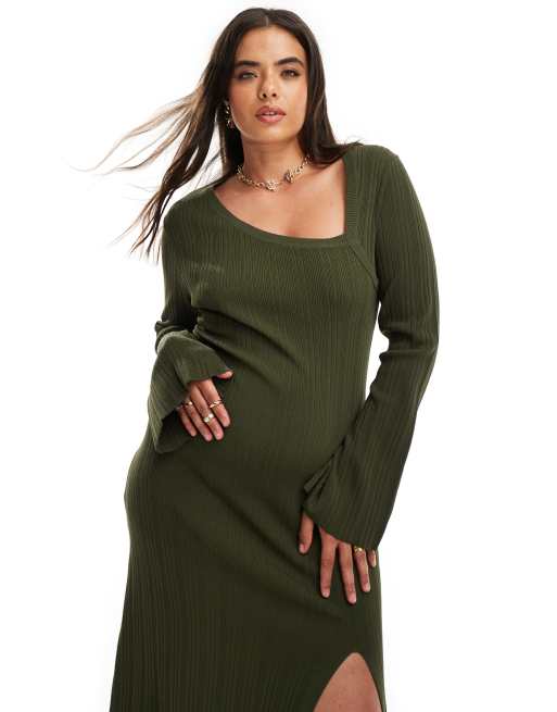 Pretty Lavish Curve asymmetric knitted thigh split midi dress in olive
