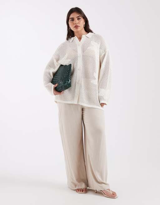 Pretty Lavish Curve open knit floral oversized shirt co-ord in cream