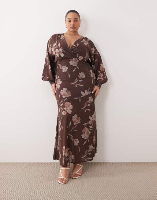 Pretty Lavish Curve wrap front and back batwing sleeve maxi dress in chocolate floral