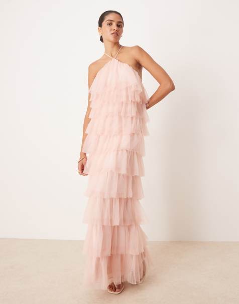 Pretty Lavish backless tulle ruffle maxi dress in peony pink