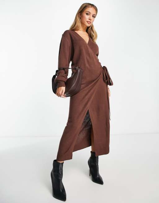 Pretty Lavish Beau wrap knit dress with tie waist in chocolate