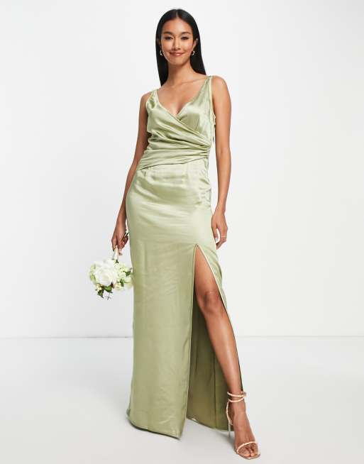 Pretty Lavish Bridesmaid satin maxi dress in olive