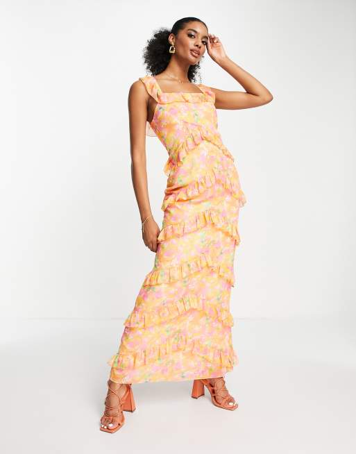 Pretty Lavish Cecile ruffle maxi dress in orange and pink abstract floral