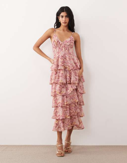 Pretty Lavish tiered ruffle midaxi dress in berry floral print