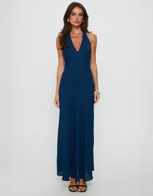 Princess Polly chiffon halterneck asymmetric hem maxi dress in navy