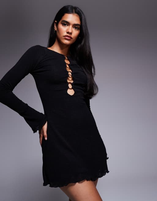 Princess Polly Dejonge lettuce edge hem ring detail open front detail mini dress in black