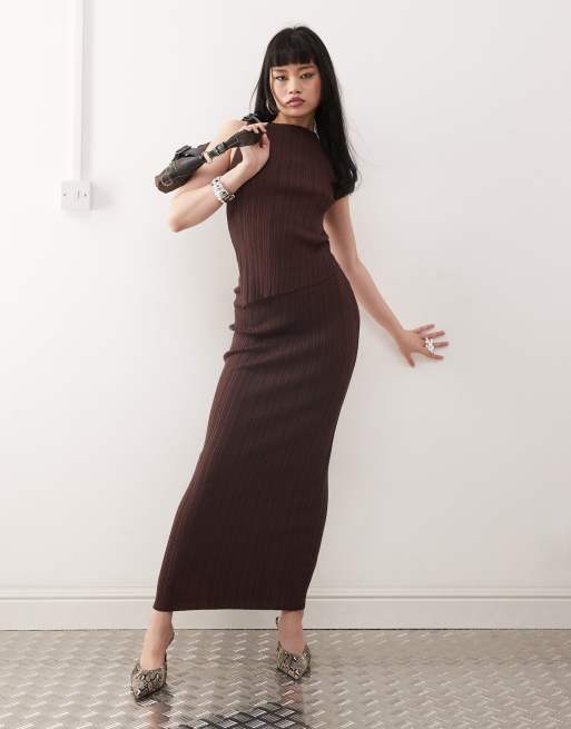 Princess Polly ribbed sleeveless asymmetric top and maxi skirt full set in chocolate