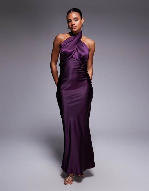 Princess Polly Rosaminta high shine satin cross front halterneck tie open back maxi dress in purple