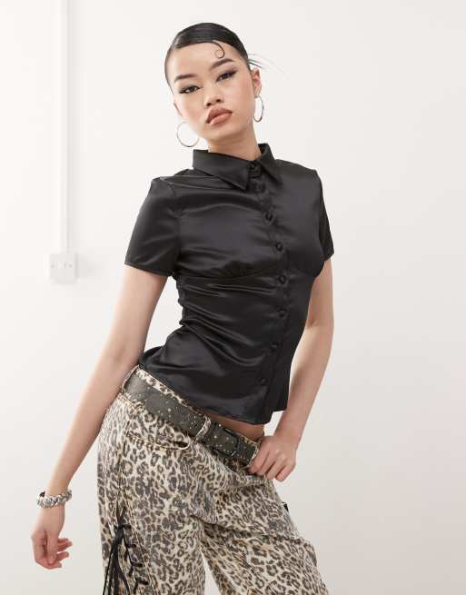 Princess Polly satin button front collared bust detail shirt in black