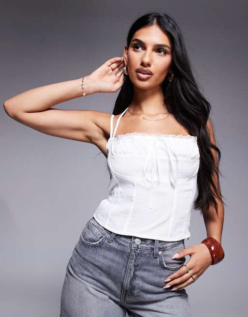 Princess Polly Trynia halterneck tie bust lace trim detail top in white