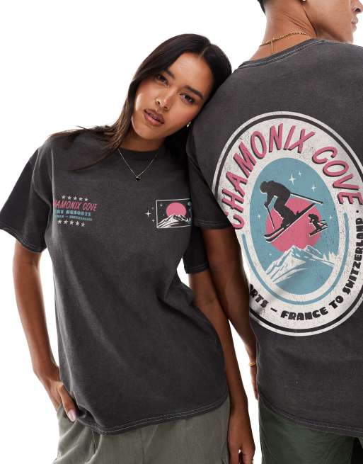 PRNT Chamonix cove front and back print washed t-shirt in charcoal overdye