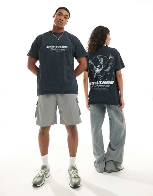 PRNT Culture worldwide front print and back print t-shirt in snow wash