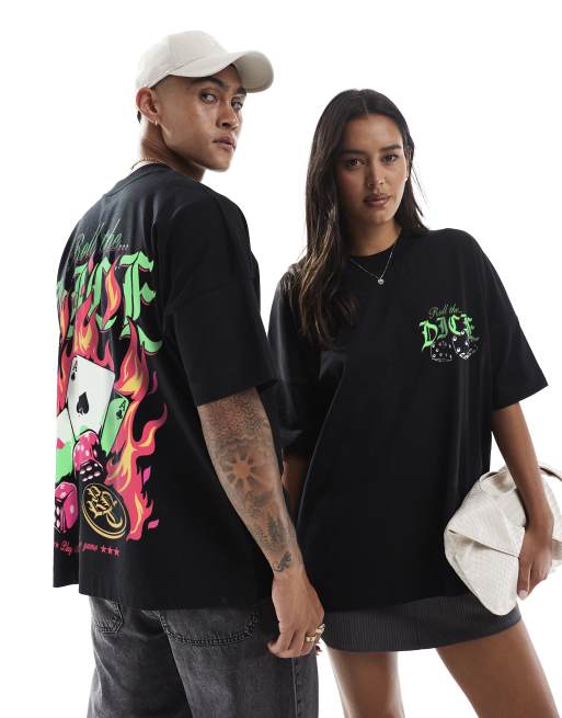 PRNT Roll the dice fire front print and back print oversized t-shirt in black