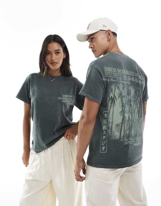 PRNT Shibuya woodblock market front and back print washed t-shirt in green overdye