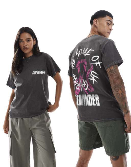 PRNT Sidewinder home front and back print washed t-shirt in charcoal overdye
