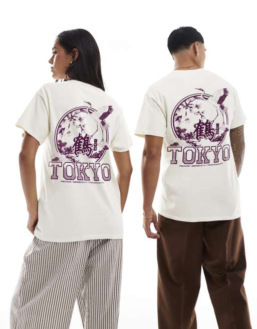 PRNT Tokyo crane front and back print washed t-shirt in ecru overdye