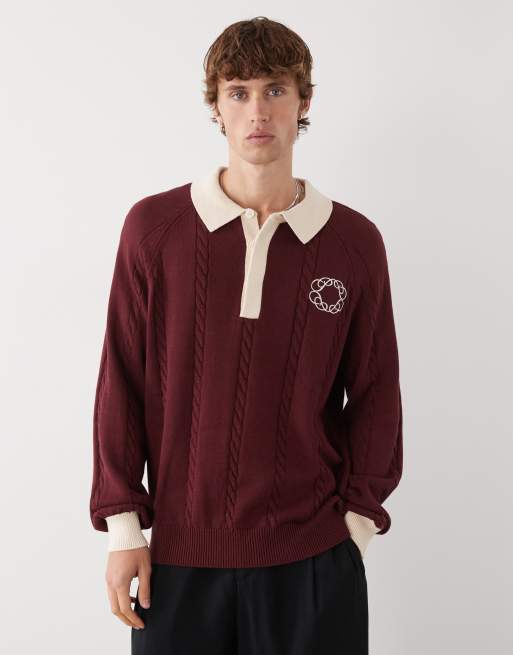 Prohibited long sleeve oversized emblem logo knit polo in burgundy