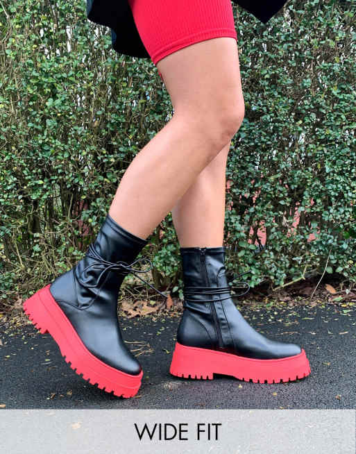Public Desire Wide Fit Finale chunky flat ankle boots with tie in black and red