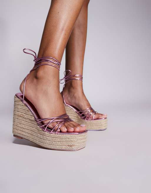 Public Desire Wide Fit Heated wide fit strappy lace up jute wedges in pink