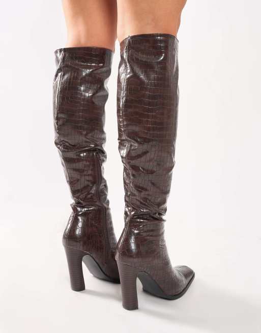 Public Desire Acquilla croc knee high flared heel boots in brown croc