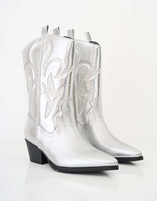 Public Desire Calabasas western embroideknee high pointed toe cowboy boots in silver