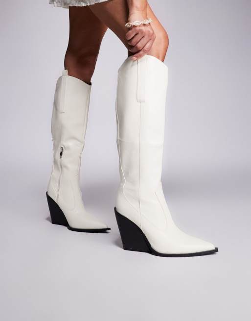 Public Desire Nevada western cowboy pointed toe block heel knee high boots in ecru