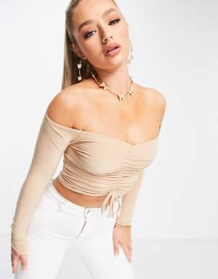 Public Desire ruched off shoulder crop top co ord in stone