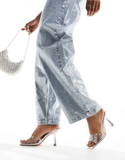 Public Desire Shelly mid heeled sandal with clear embellished strap in silver