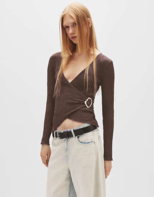Pull&Bear Crêpe crossover top with buckle in brown