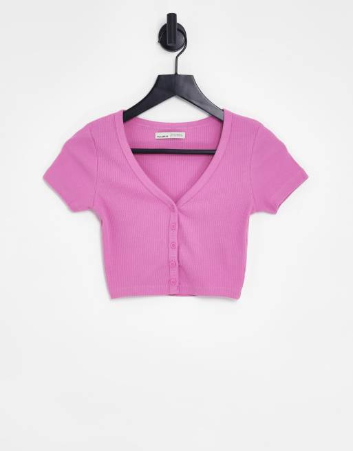 Pull&Bear cropped button down t-shirt in pink