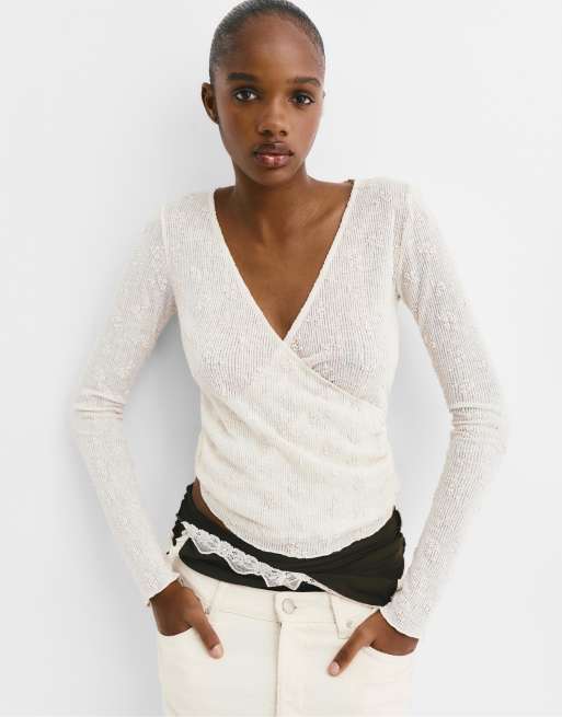 Pull&Bear Crossover knit floral top in beige
