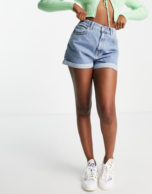 Pull&Bear elasticated waist denim mom shorts in light blue