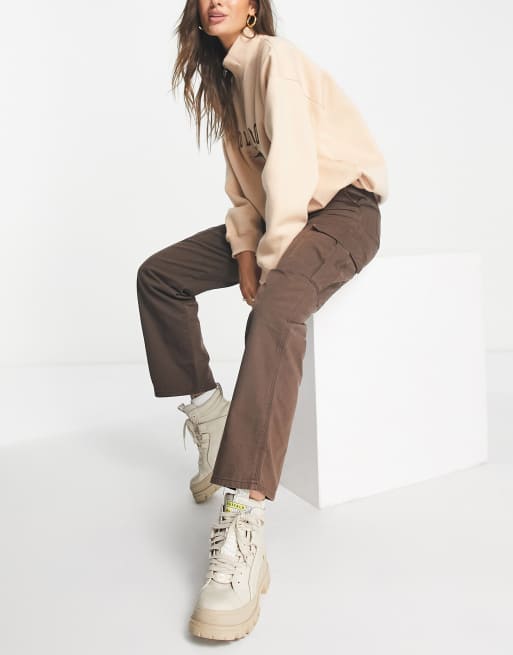 Pull&Bear high waisted straight leg cargo trousers in brown