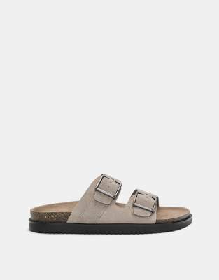 Pull&Bear leather flat slider sandals with buckle in ecru
