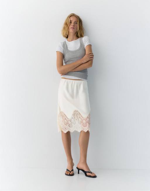 Pull&Bear Lingerie detail midi skirt in beige