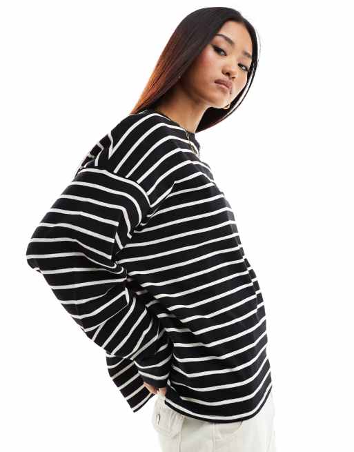 Pull&Bear long sleeve oversized t-shirt with stripe detail in black & ecru