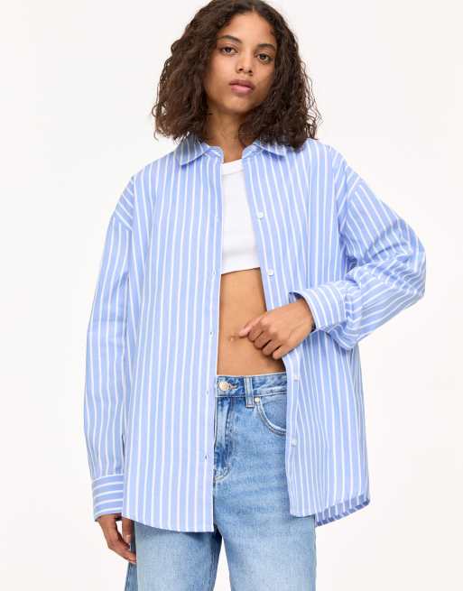 Pull&Bear oversized contrast striped shirt in blue