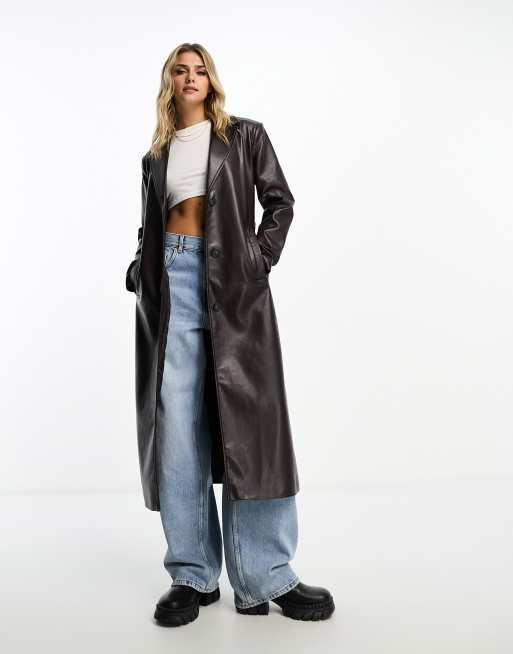 Pull&Bear premium faux leather trench coat in dark brown