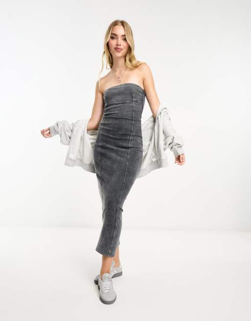 Pull&Bear ribbed seam detail bandeau midaxi dress in washed black