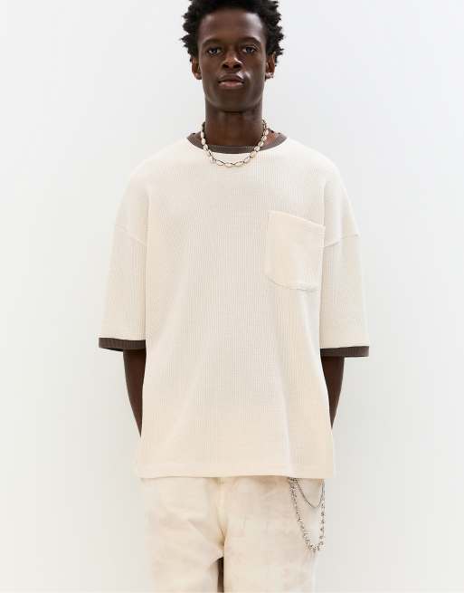 Pull&Bear Ribbed waffle-knit t-shirt in beige